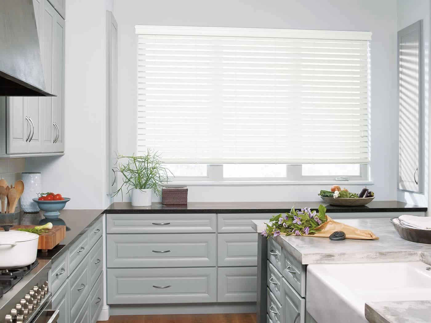 Opting for faux wood or vinyl window coverings gives you enhanced protection from moisture damage. EverWood® Faux Wood Blinds and Palm Beach™ Polysatin™ Vinyl Shutters are two fantastic options, particularly for humid areas in your home. Both styles resist warping and peeling when exposed to moisture and are easy to wipe clean if any pesky mildew does develop.