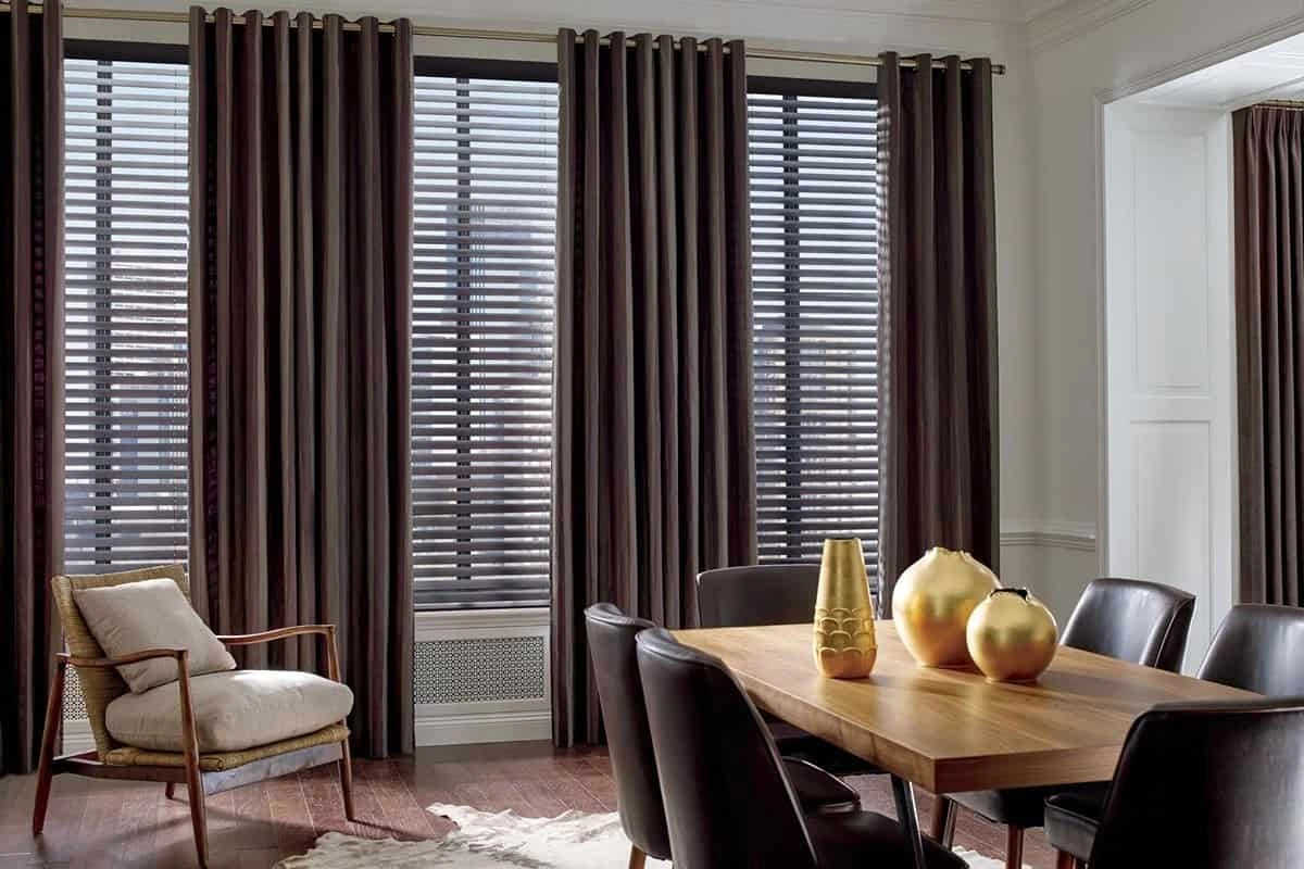 Either curtains or drapes, combined with blinds, work very well together. Pairing the two window treatments offers significant light control alongside clean lines. This combination also provides you with hundreds of options, since there are so many different kinds of curtains, drapes, and blinds available. Try pairing light and dark or solid fabric panels with brushed wood blinds from Hunter Douglas. We recommend choosing the blinds first, as they are more critical for light control, and then choosing curtains or drapery to complement the blinds.